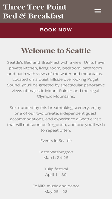 89%Set n a hillside overlooking Puget Sound, Three Tree Point B&B offers breathtaking panoramic views. Click to view & book direct.
