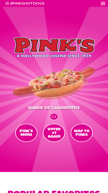 100%Join countless Hollywood celebrities and visit Pink’s Hollywood for an experience like no other. A Hollywood Legend Since 1939!