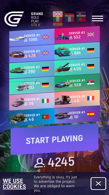 87%we invite you to plunge into the unforgettable atmosphere of role play on grand rp, to experience some whole new impressions with our friendly community. unique scripts that you definitely wouldn't find on other servers.