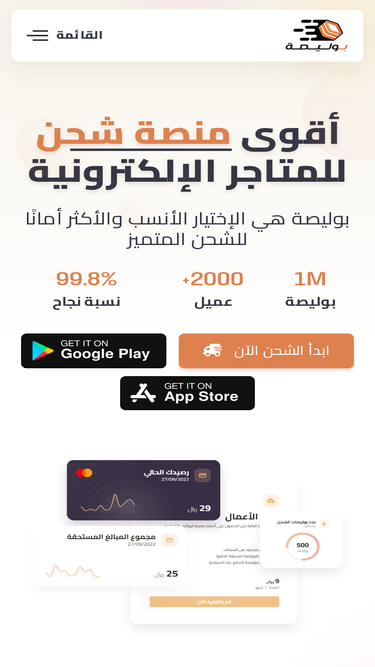 95%بوليصة هي الإختيار الأنسب والأكثر أمانًا للشحن المتميز. منصة شحن متكاملة تربط المتاجر الإلكترونية بأفضل شركات الشحن في المملكة العربية السعودية