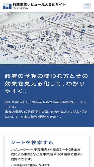 政府が実施する予算事業や基金事業の情報のデータベースです。 事業の概要、成果目標や実績、支出先などを、関心・目的に応じて、自由に検索・閲覧できます。