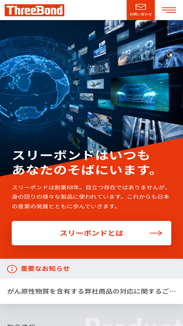 72%スリーボンドホールディングスのウェブサイト。工業用シール剤・接着剤及びその塗布装置の開発・製造・販売を行っております。