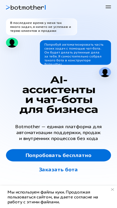 81%Создавайте своих полезных ботов для Telegram на простом конструкторе Sambot.ru. Пользуйтесь готовыми модулями и платите только за результат. Делегируйте рутинную работу в Telegram роботу. Процесс настройки нашего бота - не более 30 минут. Программируйте сценарии поведения один раз и автоматически пользуйтесь ими в дальнейшем.