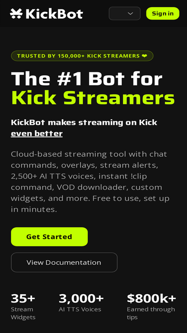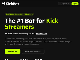 100%The #1 bot for Kick.com streamers. Chat commands, alerts, overlays, AI TTS with 2,500+ voices, VOD downloader, widgets, and instant clip command. Free and cloud-based.