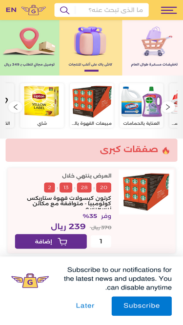 92%قروسرجي - تسوق و اطلب مقاضي البقالة و السوبر ماركت في السعودية بالإضافة إلى تشكيلة واسعة من الأجهزة الكهربائية و مكائن تحضير القهوة و احصل على خصومات استثنائية . ادفع اون لاين من خلال أبل باي، فيزا أو ماستر كارد، مدى أو اس تي سي باي.