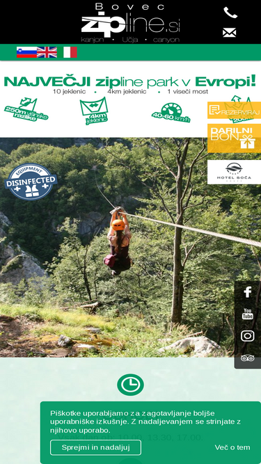 98%NAJVEČJI ZIPLINE PARK V EVROPI v kanjonu Učja, nudi: - 10 jeklenic v dolžinah 250-600m v skupni dolžini 4 km, - 1 viseči most, - 2 uri čistega adrenalina, zabave in druženja ter - čudovite panoramske razglede proti kanjonu Učje, bovški kotlini in Triglavu.?