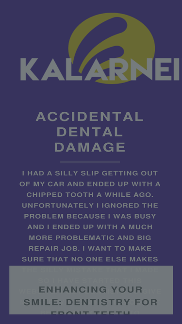 98%i had a silly slip getting out of my car and ended up with a chipped tooth a while ago. unfortunately i ignored the problem because i was busy and i ended up with a much more problematic and big repair job. i want to make sure that no one else makes the silly mistake that i made so i have started this website. i get dentists to give me interviews and tips on the best way to react to accidental dental damage so that you don't do permanent damage to your mouth. i hope you enjoy the site and find it useful.