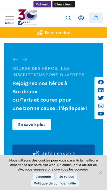 74%Editeur du site internet Le site www.fondation-epilepsie.fr est édité par la Fondation Française pour la Recherche sur l’Épilepsie. Fondation Française pour la Recherche sur l’Épilepsie (FFRE)Hôpital Necker Enfants MaladesBâtiment Carré NeckerPorte N1 3ème étage droite149 rue de Sèvres75015 ParisFrance Tél : 01 47 83 65 36 Mail : ffre@fondation-epilepsie.fr Hébergement Le site www.fondation-epilepsie.fr est hébergé chez OVH : 2 rue […]