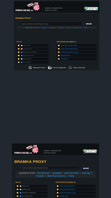 99%szybka i bezpieczna polska bramka proxy. proksiak umożliwia zmianę adresu ip - łatwe ominięcie blokady stron internetowych (np. facebook, allegro, youtube) w pracy lub szkole.