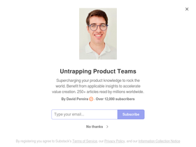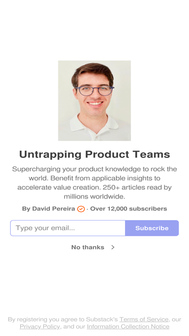 65%Weekly insights on overcoming challenges product people often struggle with. You'll learn from reality, not fantasy! Join us to level up your game! Click to read Untrapping Product Teams, by David Pereira, a Substack publication with tens of thousands of subscribers.