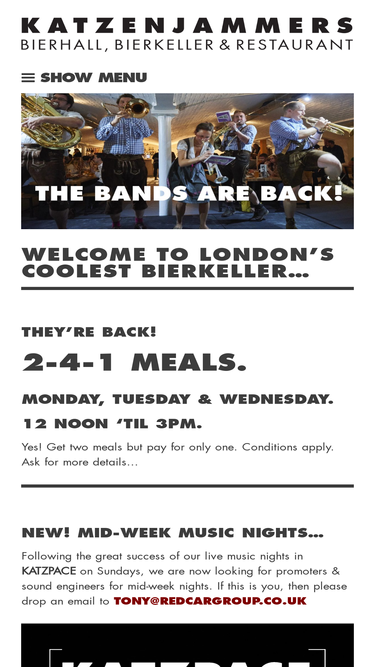 87%KATZENJAMMERS THE HOP EXCHANGE 24 SOUTHWARK STREET LONDON SE1 1TY OPENING HOURS : BIERKELLER MON. – THURS. / 12 – 11PM FRI. & SAT. / 12 – 12 MIDNIGHT SUN. / 12 – 10.30PM K2 BIERHALL THUR…