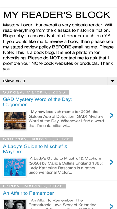 87%Mystery Lover...but overall a very eclectic reader. Will read everything from the classics to historical fiction. Biography to essays. Not into horror or much into YA. If you would like me to review a book, then please see my stated review policy BEFORE emailing me. Please Note: This is a book blog. It is not a platform for advertising. Please do NOT contact me to ask that I promote your NON-book websites or products. Thank you.