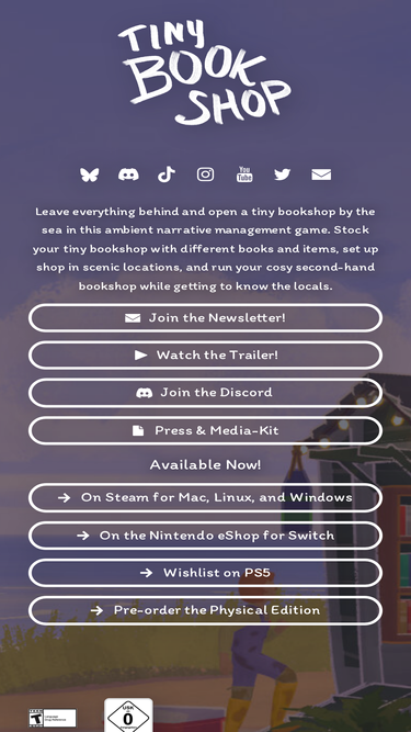 79%Leave everything behind and open a tiny bookshop by the sea in this ambient narrative management game. Stock your tiny bookshop with different books and items, set up shop in scenic locations, and run your cosy second-hand bookshop while getting to know the locals.