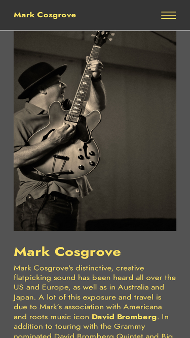 100%guitarist mark cosgrove, well known for his flatpicking guitar style, is equally at home on the acoustic and electric guitar as well as the mandolin - playing americana, bluegrass, blues, rock and more