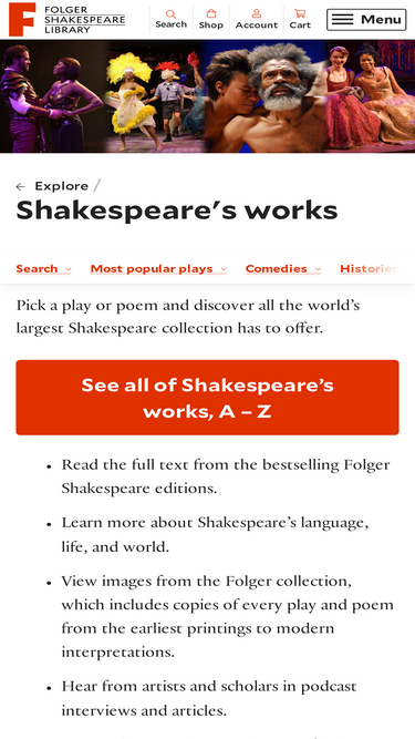 73%Folger Shakespeare Library is the world's largest Shakespeare collection, the ultimate resource for exploring Shakespeare and his world. Shakespeare belongs to you. His world is vast. Come explore. Join us online, on the road, or in Washington, DC.