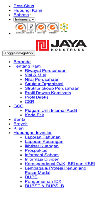 85%pt jaya konstruksi manggala pratama, tbk adalah salah satu perusahaan konstruksi di indonesia yang telah berhasil beroperasi selama lebih dari empat dekade. kami telah menyelesaikan lebih dari dari ribuan proyek-proyek besar dan kecil. ini menjadi bangga besar kami. kesuksesan pt jaya konstruksi mp tbk adalah hasil dari kerja keras dan kesabaran dari staf kami yang berdedikasi dan disiplin untuk mencapai produk yang berharga dan dapat dipercaya. pencapaian tertinggi diberikan dari pemerintah dan perusahaan swasta nasional sebagai klien kami, seperti: metropolitan development, mulia group, ometraco group. dan internasional seperti: medali emas dalam konstruksi yang merupakan penghargaan ifawpca builder yang diberikan oleh asosiasi internasional industri konstruksi, medali perak di research award konstruksi ifawpca untuk wilayah barat dan asia.