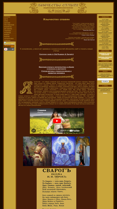 энциклопедия славянского язычества. религия, мифология, магия и культура славян. представлена следующая информация: боги и духи славян, заговоры, гадания, список славянских имен, обряды и приметы, книги языческой тематики, языческий форум и ссылки на тематичные сайты.