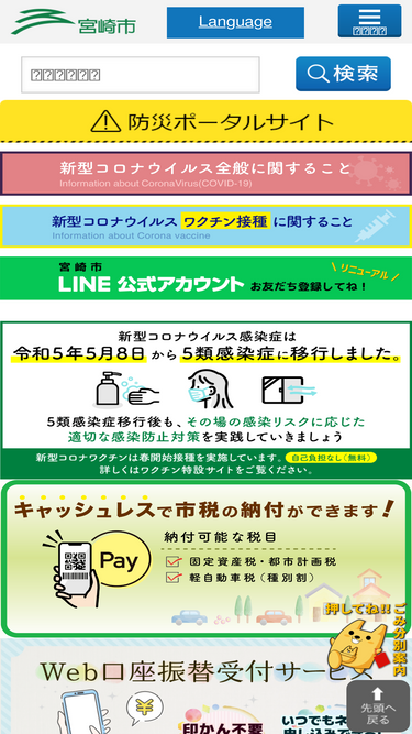 100%宮崎市の公式ホームページです。「くらし・手続き」「子育て・教育」「健康・福祉」「観光・文化」「産業・事業者」「市政情報」の分類別に、宮崎市から各種情報を掲載しています。