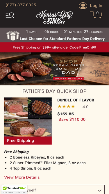 72%Gift the ones you love a premium steak gift box. Six incredible steaks boxed and ready to delight. 2 Super Trimmed™ Filet Mignon, 8 oz each 2 Kansas City Strips, 12 oz each 2 Ribeyes, 10 oz each