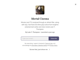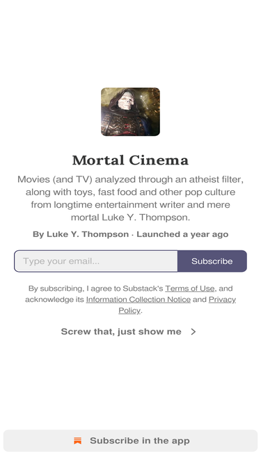 67%I'm Luke Y. Thompson. Everyone has opinions. No-one else has my life. Here there are no filters, editors, or pre-assigned topics. Let's talk movies, toys, fast food, theology, and all the places I've been, physically and otherwise. Click to read ill LYTeracy, a Substack publication with hundreds of subscribers.
