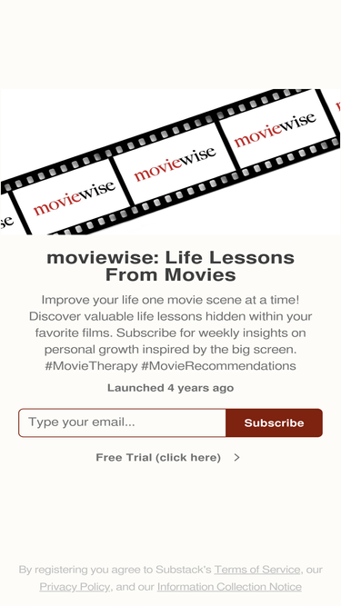 73%Improve your life one movie scene at a time! Discover valuable life lessons hidden within your favorite films. Subscribe for weekly insights on personal growth inspired by the big screen. #MovieTherapy #MovieRecommendations. Click to read moviewise: Life Lessons From Movies, a Substack publication with hundreds of subscribers.