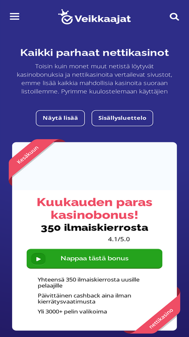 89%Veikkaajien puolueettomassa vertailussa parhaat ja luotettavat nettikasinot – suomalaisilta suomalaisille jo vuodesta 2011. Löydä uusi suosikkisi täältä!