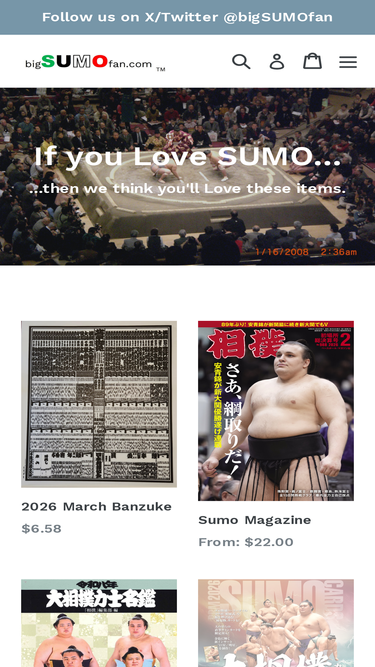 86%Official Japanese Sumo Wrestling calendar, banzuke, trading cards, bumper stickers, bumper magnets, hats, t-shirts, tegata, coffee mugs, souvenirs, and other SUMO merchandise for sale from the US.