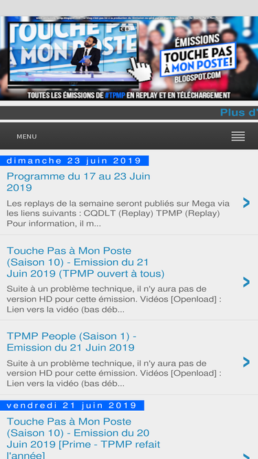 92%Blog regroupant toutes les émissions de Touche Pas à Mon Poste (TPMP) sur France 4 et C8 en replay (streaming) et en téléchargement.