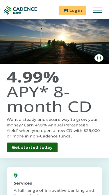 78%Welcome to Cadence Bank. We meet customers where they are in their financial journey, providing expert advice and a broad array of products and services to help them reach their goals.