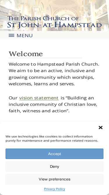 56%welcome to hampstead parish church. we aim to be an active, inclusive and growing community which worships, welcomes, learns and serves. our vision statement is “building an inclusive community of christian love, faith, witness and action”. news from the vicar ‘for where your treasure is, there your heart will be also’ (matthew 6.21) sunday 6…