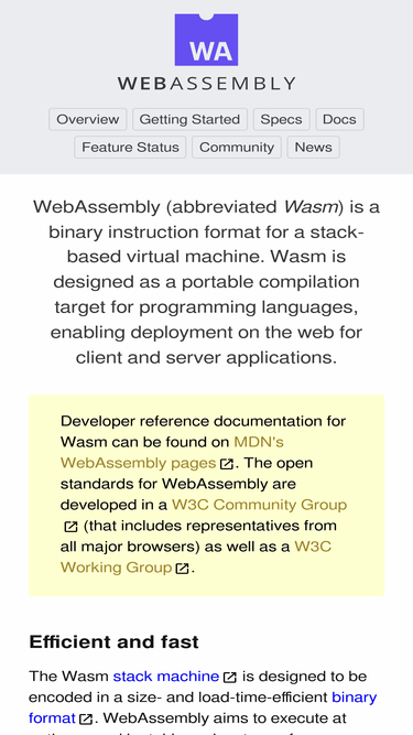 WebAssembly (abbreviated Wasm) is a binary instruction format for a stack-based virtual machine. Wasm is designed as a portable compilation target for programming languages, enabling deployment on the web for client and server applications.