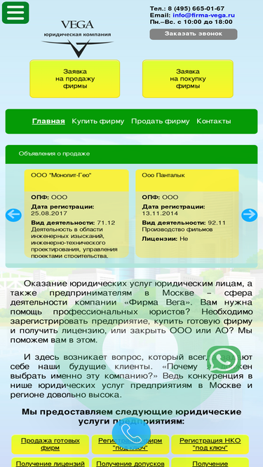 «фирма вега» - юридические услуги для бизнеса: регистрация фирм и изменений, лицензирование деятельности, сертификация и декларирование, банкротство и ликвидация фирм, готовые фирмы,некоммерческие организации (нко), юридические адреса, услуги бухгалтерского сопровождения, обучение специалистов, аудит. стоимость обслуживания для юридических лиц и предприятий под ключ.