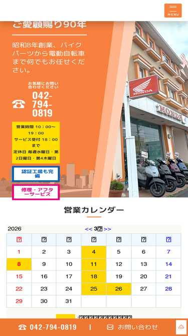 89%東京町田市のホンダ専門店です。ジョルノ・PCXからタクトベーシックまでホンダスクーターを展示しています。認証工場も完備し、修理・アフターサービスもしっかりサポート。 パナソニック電動アシスト自転車も充実展示。試乗車にてご体感ください。