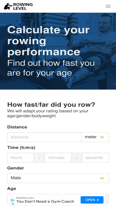 71%calculate male/female rowing performance for all distances including 500m, 1000m, 2000m and 5000m. compare your races against other rowers the same age. compete with friends.
