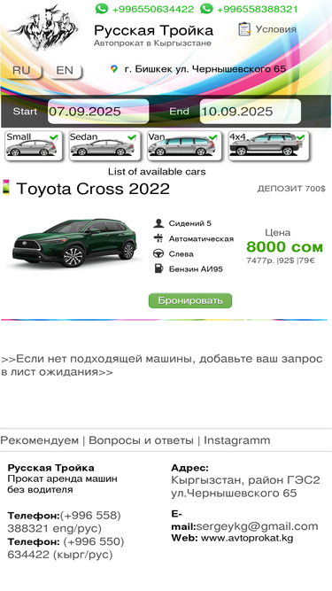 26%Rent a car in Kyrgyzstan: Jeep Wrangler, Toyota 4Runner, Subaru Forester and more. Airport delivery, fair pricing, ready for your adventure.