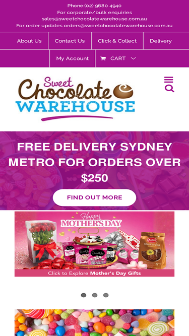 92%Delivery Purchasing & Delivery Methods Sweet Chocolate Warehouse aims to make shopping easier and convenient. Please view our Terms and Conditions page which also outlines our Privacy Policy. To talk directly with our customer service team, please call 02 9680 4940 during our retail trading hours. Alternatively, email us at sales@sweetchocolatewarehouse.com.au or contact us