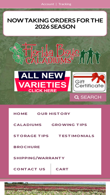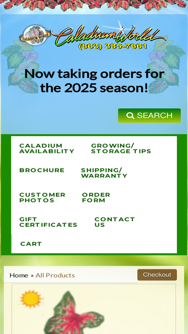 100%Caladiums Florida, grower of over 40 colorful varieties of premium caladium bulbs and the worlds largest distributor of Elephant ears bulbs.