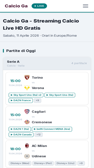 100%Calcio Ga: il miglior sito di streaming calcio live HD gratis. Guarda in diretta Serie A, Champions League, Premier League, La Liga, Bundesliga e tutte le partite di calcio senza abbonamento. Non perderti nemmeno un gol!