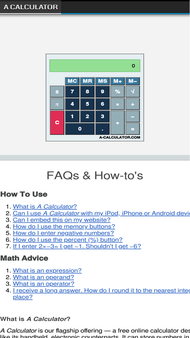 89%a simple online calculator. allows embedding and includes frequently asked questions on the memory and percentage buttons.