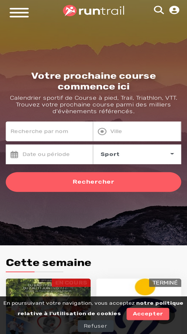RunTrail est un calendrier d'évènement sportifs de Course à pied, Trail, Triathlon, VTT... Trouvez et planifiez vos prochaines courses, créez et partagez votre calendrier sportif. Organisateurs, publiez gratuitement votre évènement en quelques clics. Résultats, vidéos, parcours, avis, commentaires, badges finisher, posters de course.