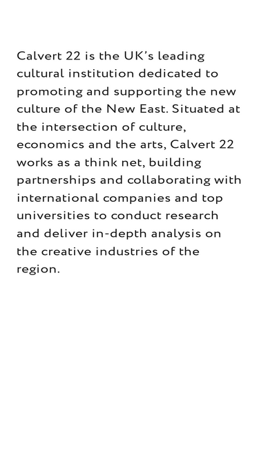 Calvert 22 Space is our London headquarters which hosts a multidisciplinary programme of exhibitions and events, talks, workshops and film screenings FREE ENTRY