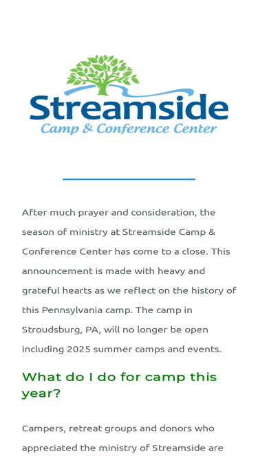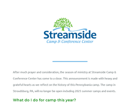 92%After much prayer and consideration, the season of ministry at Streamside Camp & Conference Center has come to a close. This announcement is made with heavy and grateful hearts as we reflect on the history of this Pennsylvania camp. The camp in Stroudsburg, PA, will no longer be open