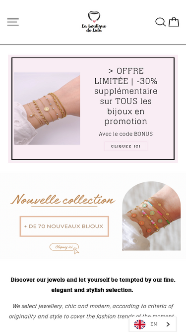 90%La boutique en ligne "La boutique de Lulu" votre spécialiste de bijoux en acier inoxydable résistants à l’eau et qui ne noircissent pas ! Également la boutique de Lulu, vous sélectionne des bijoux à la pointe de la mode qui apporteront la touche finale à votre tenue.
