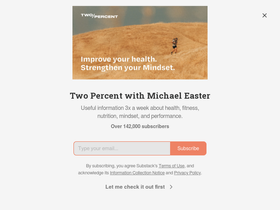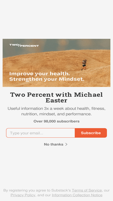73%Useful information 3x a week about health, fitness, nutrition, mindset, and performance. Click to read Two Percent with Michael Easter, a Substack publication with hundreds of thousands of subscribers.