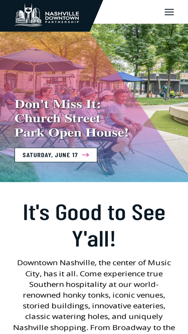 76%Downtown Nashville is OPEN. Discover downtown events, concerts, shows, art and gallery openings, games and parking options. Stroll through various urban neighborhoods, including The Gulch and SoBro. There's always something going on downtown!