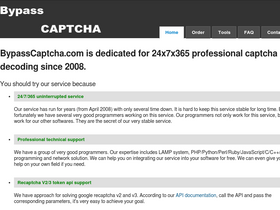 100%bypasscaptcha.com is dedicated for captcha decoding since 2008. it runs 24x7x365, and is supported by experts previously working for microsoft, google and intel. it owns detailed statistics since the first day you start using it, and so no hidden fee.