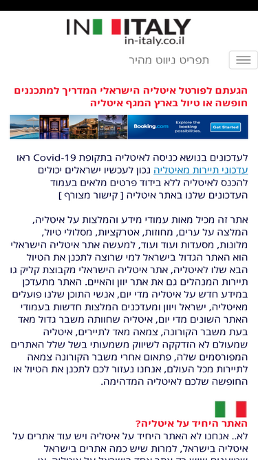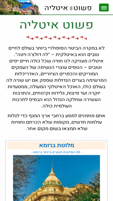 72%אתר איטליה הישראלי italy הוא מדריך טיול מקיף של איטליה, הכולל מידע והמלצות על אטרקציות באיטליה, מלונות באיטליה, מסלולי טיול באיטליה ומידע עדכני מלא על איטליהכולל רשימת ערים באיטליה