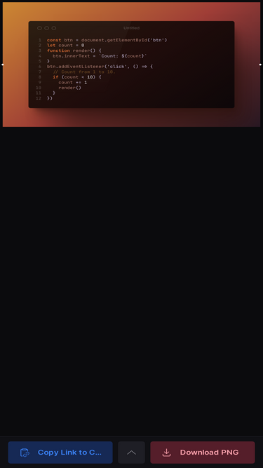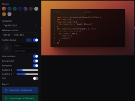 90%Easily convert your code snippets into beautiful, shareable images with the Code to Image Generator. Perfect social media and documentation visuals. Ideal for developers, bloggers, and educators!