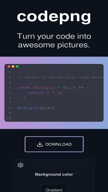 Turn your code into beautiful images. Choose from a range of syntax colors, hide or show the background, and toggle between a dark and light window.