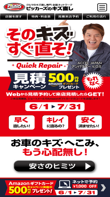 96%愛知県の専門店一覧 - 自動車の修理・板金塗装はピッカーズ!車すりキズ7,700円〜! 格安料金でも確かな技術で大事なお車の傷をキレイに直します。日本全国1,300店舗のネットワーク! 明朗な価格で安心の無料見積!